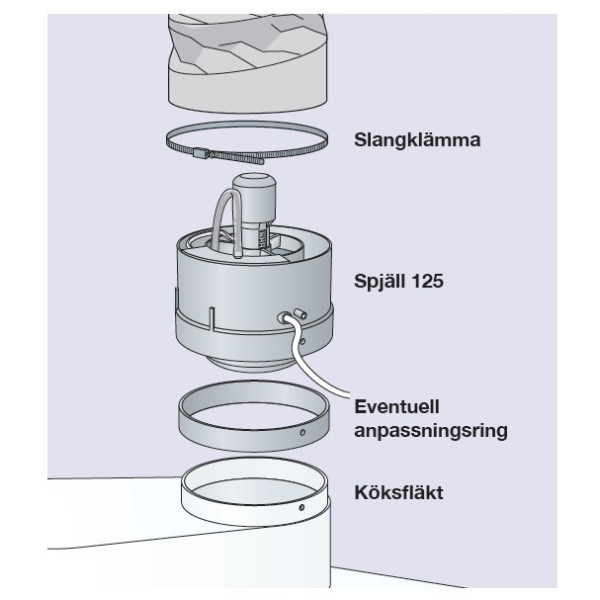 Montering av Sirrus KFS 125 ansluts enkelt mot köksfläktens öppning, anpassningsring följer med. Träd på slangen och slangklämma.