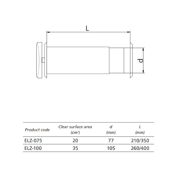 ELZ teleskopiska luftventiler utan värmeisolering levererar frisk luft till inomhusutrymmen. Ena änden av ELZ-ventilen har ett utomhusluftintag med jalusier och ett skyddsnät. Den andra - inomhus - änden har en rund lufttillförselventil med justerbar öppning.
