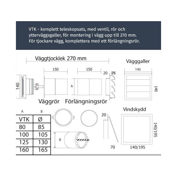 Levereras komplett med termostatbulb i temperaturområdet från -5 till +10°C, samt väggenomföring och ytterväggsgaller.
