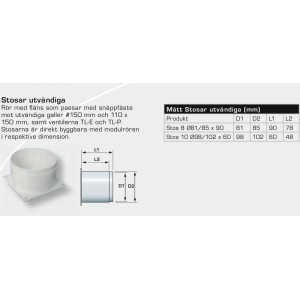 Rör med fläns som passar med snäppfäste mot utvändiga galler #150 mm och 110 x 150 mm, samt ventilerna TL-F, TL-E och TL-P. Stosarna är direkt byggbara med modulrören i respektive dimension.