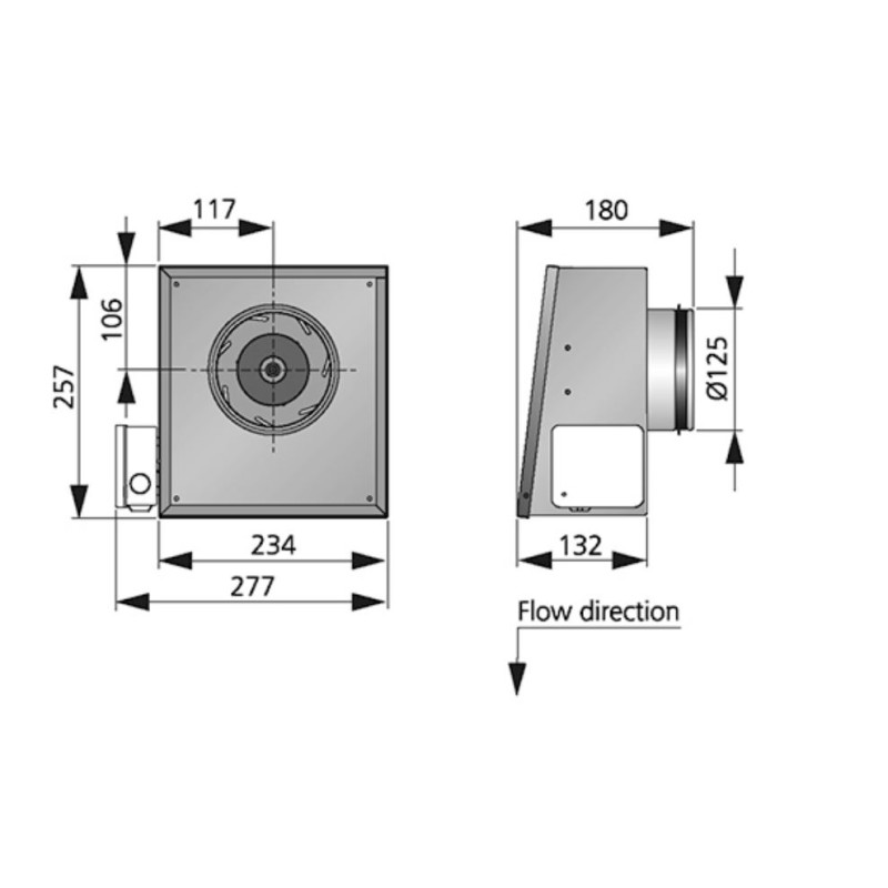 Frånluftsväggfläkt RS 125 C EC med cirkulärt inlopp är konstruerad för montering på yttervägg.