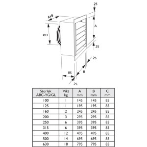 ABC-YG/GL är ett ytterväggsgaller för uteluft/avluft vid skyddade och normalt utsatta lägen.