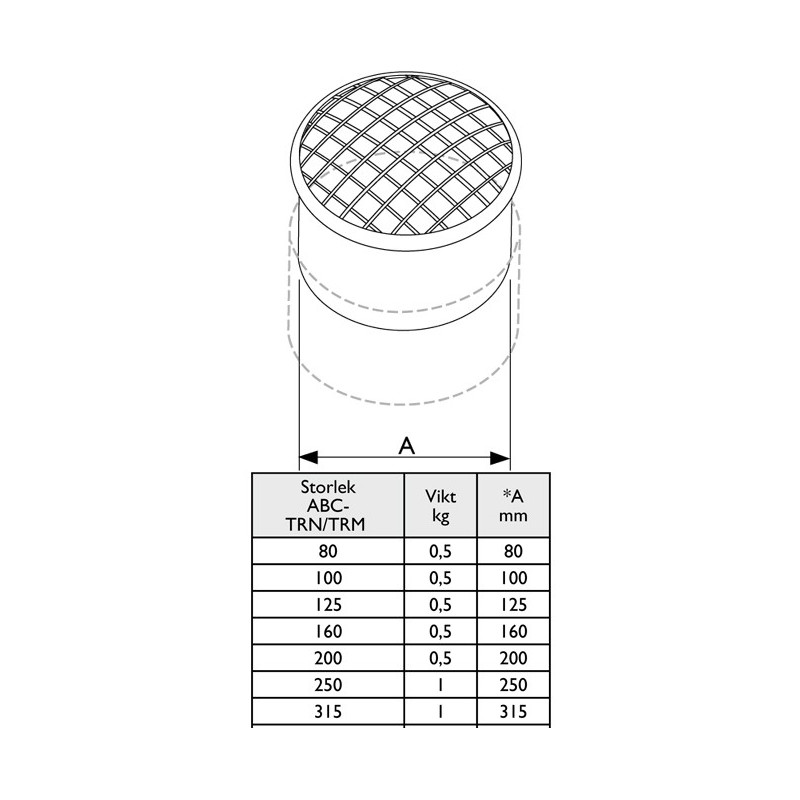 ABC-TRN är ett cirkulärt trådnätsgaller med nippel-mått i spirostandard(träs in i cirkulärt rör).
